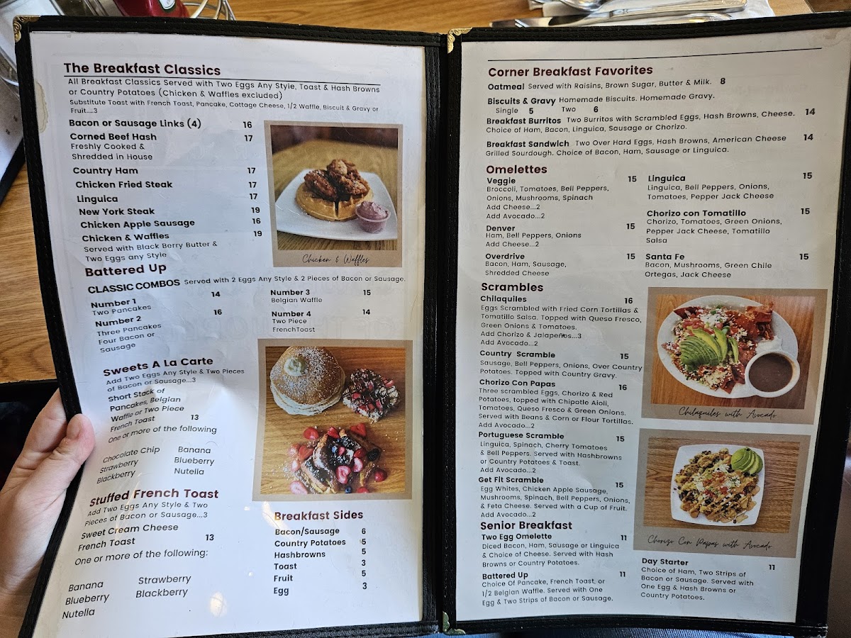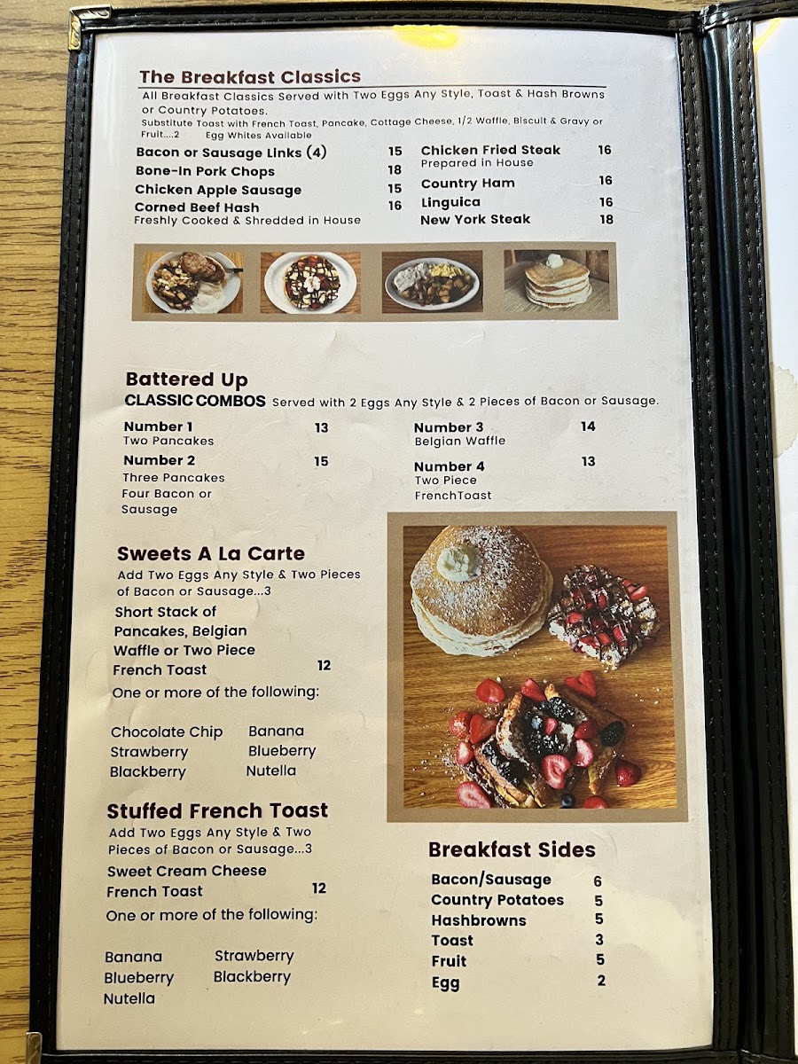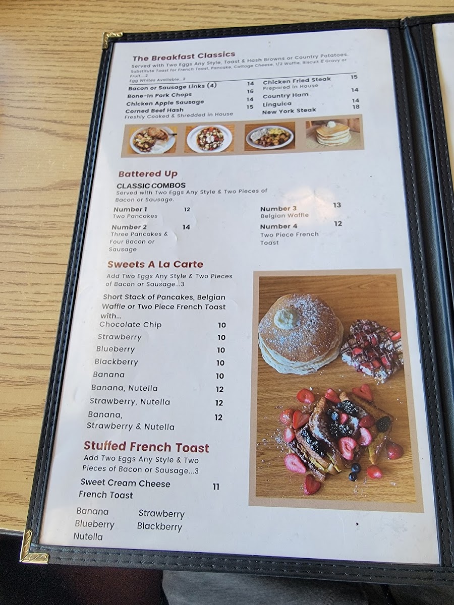 Typical offerings include breakfast standouts like biscuits and gravy, sweet cream stuffed French toast, and savory options such as chicken fried steak paired with scrambled eggs. For those looking for something lighter or fresh, dishes like the Santa Fe omelette and chicken Caesar salad provide a balanced alternative. Sweet finishes come in the form of buttermilk pancakes, banana fosters French toast, or a classic Belgian waffle, all pairing well with refreshing drinks like iced tea or strawberry lemonade.